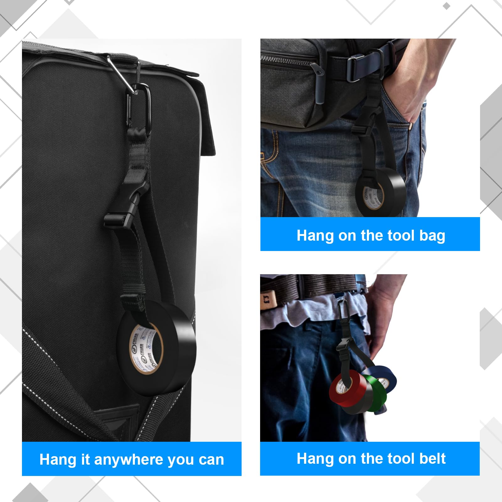 Organize tape rolls, cables, and ropes with this durable tool belt holder. Features an adjustable strap, quick-lock buckle for one-handed access, and your choice of hook-and-loop or carabiner attachment. Made from high-density nylon with a 50 lb capacity, it fits standard belts and loops.